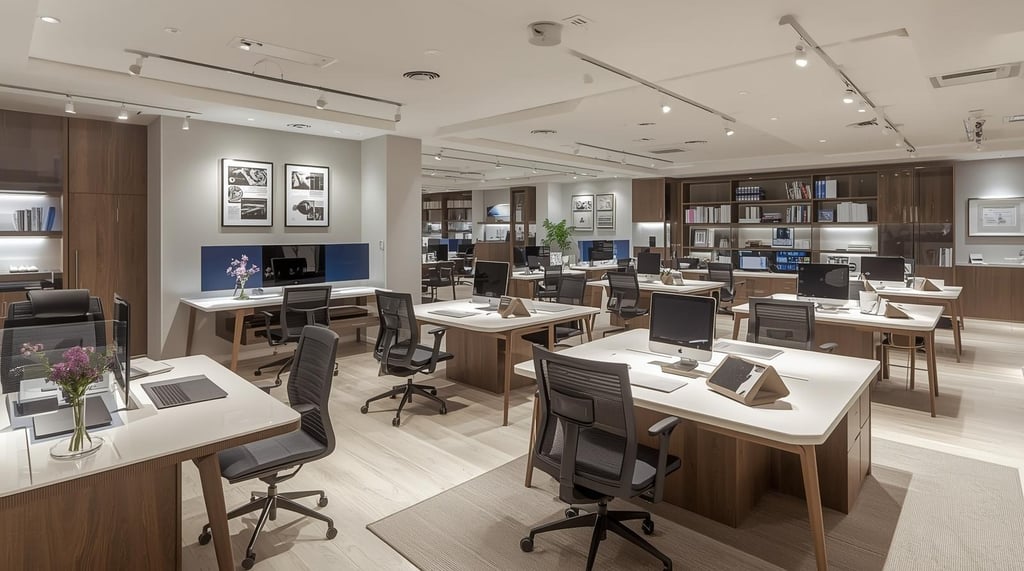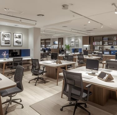 Collaborative Furniture: Conference tables and lounge pods designed for teamwork and brainstorming sessions.